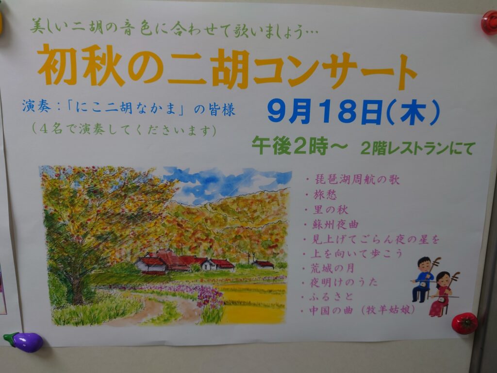 長野県の信州諏訪湖畔にある住宅型有料老人ホーム カーサ・デ・ソル諏訪湖にて、二胡のコンサートのイベントを開催しました。