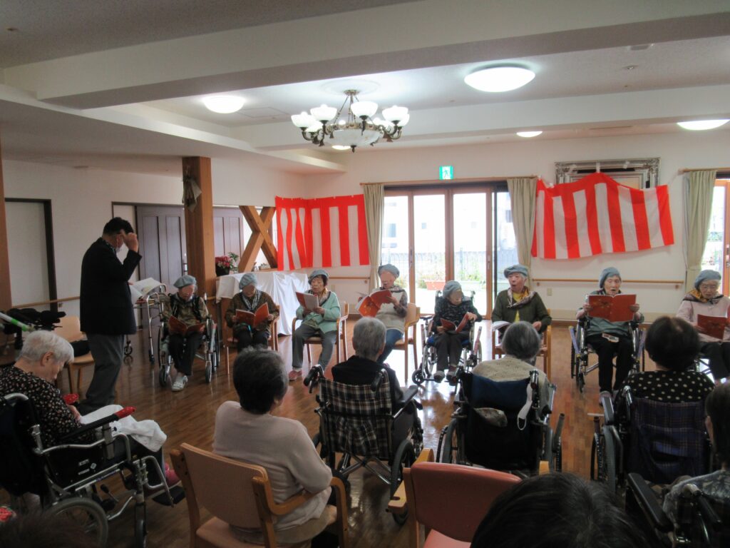 次は、毎週の音楽療法(脳トレ)に参加してくれている入居者の方々で、歌の発表を行っていただきました。 皆様元気に歌っておりました♪