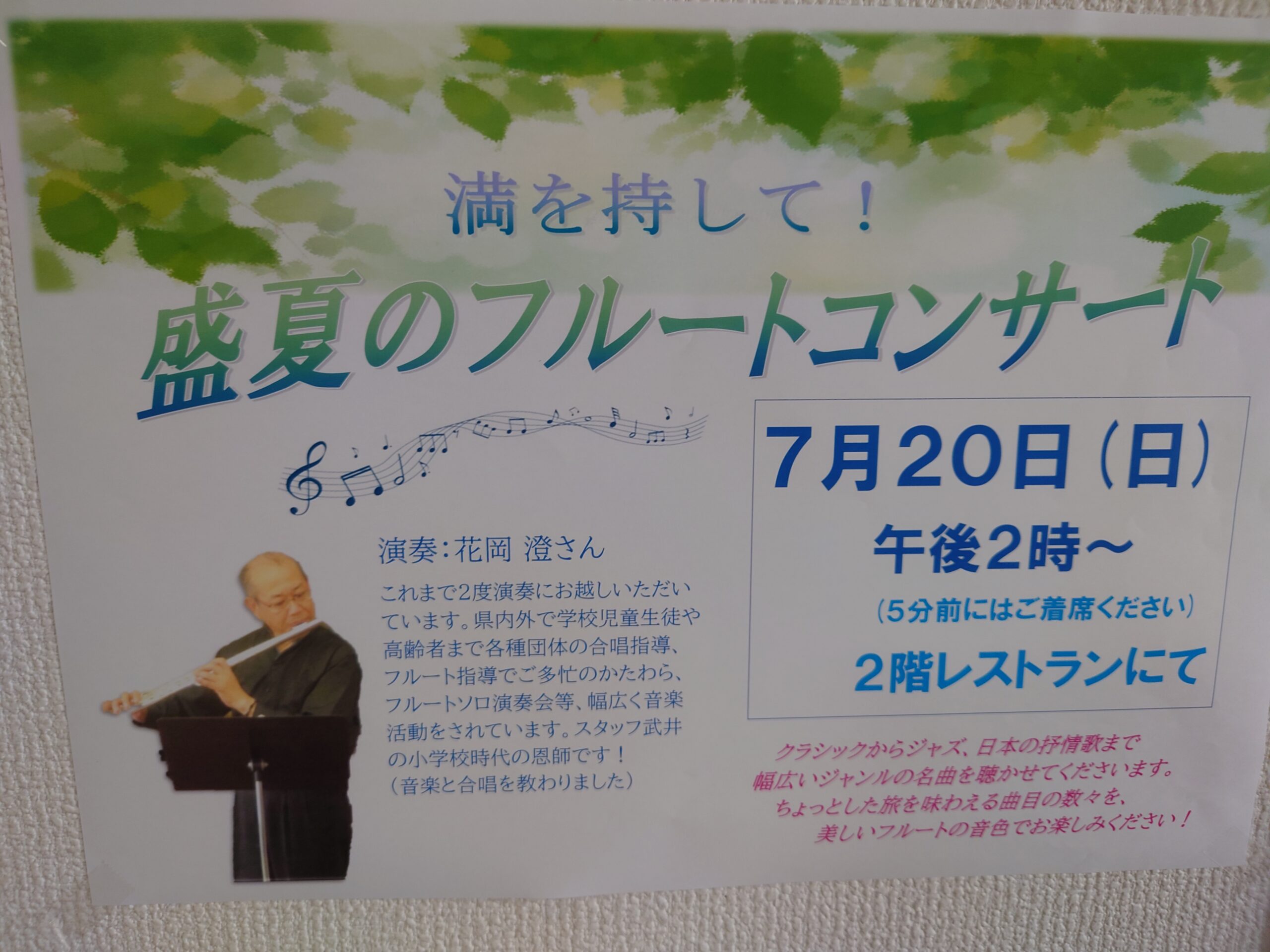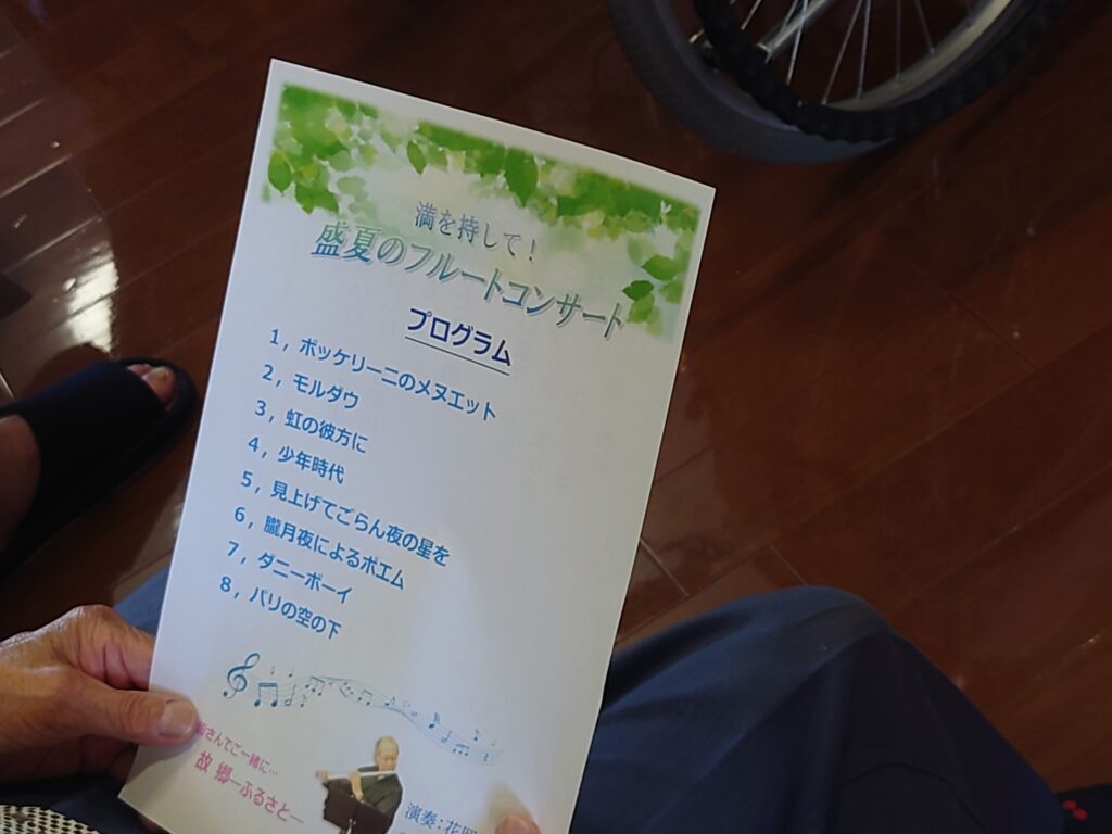 ブログ 盛夏のフルートコンサート 2025.07.21 諏訪湖畔にある有料老人ホーム、カーサ・デ・ソル諏訪湖にてフルートコンサートを開催しました。 プログラムはこんな感じです。 入居者の皆様、すばらしい音色に聞き入っていました(^^♪ 演奏して下さっている先生にはとても感謝です。是非、またお越しください。