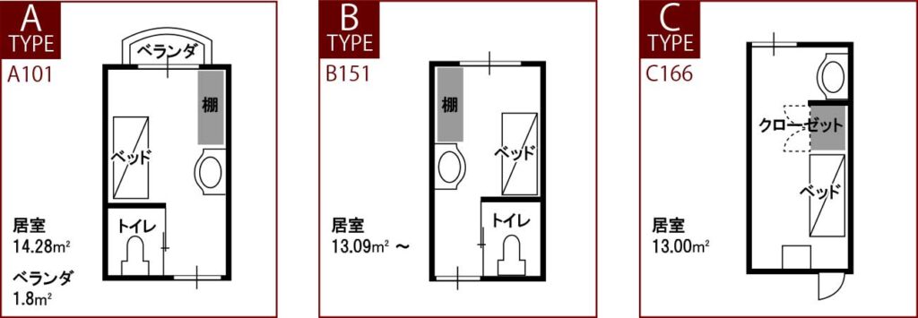 | 各居室の生活環境について | ※Cタイプの居室にはトイレはありません。 ※Cタイプの居室にはトイレはありません。 |