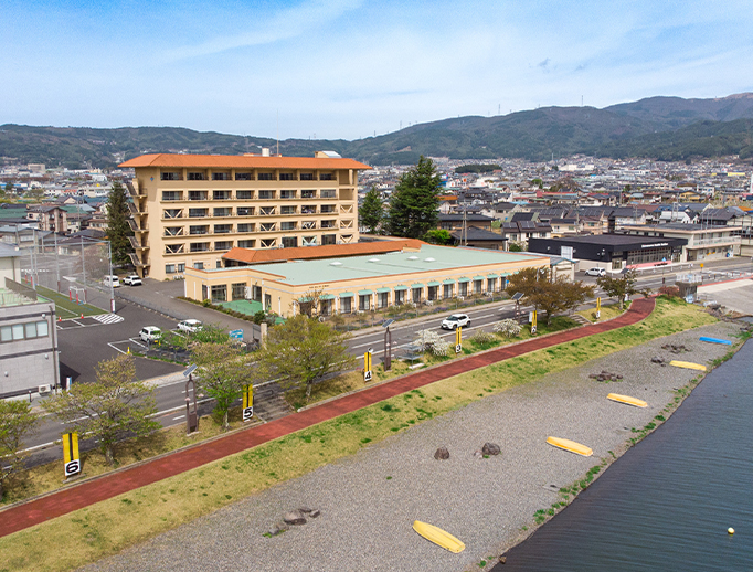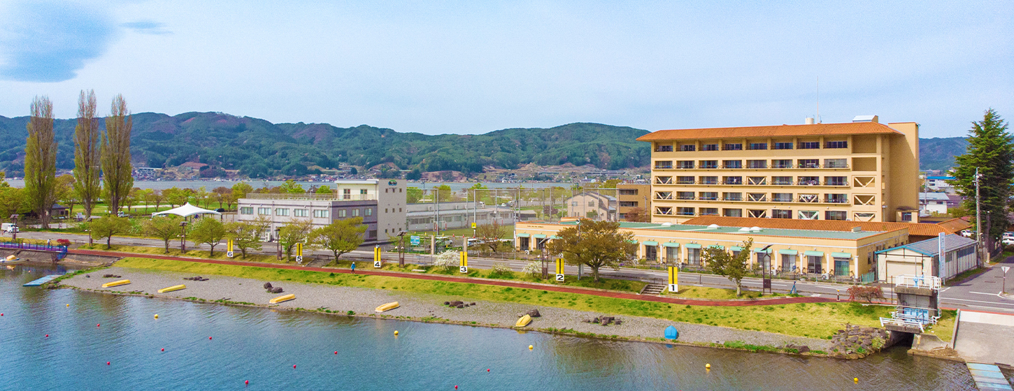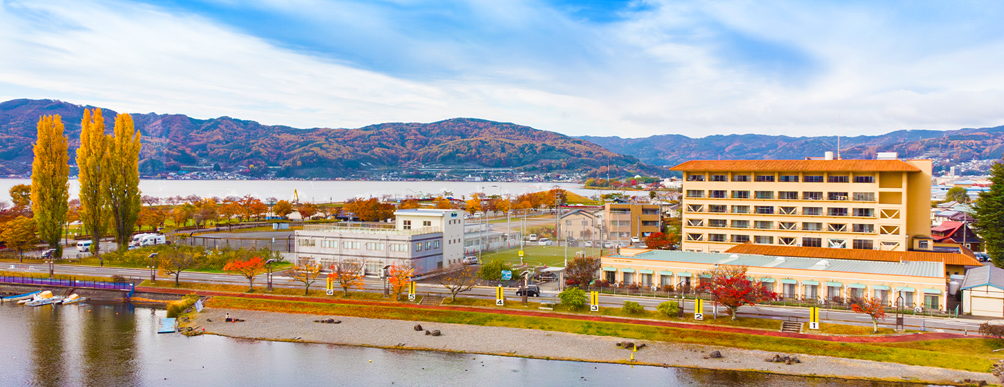 諏訪インターから約25分・岡谷インターから約10分。JR下諏訪駅からタクシーで約10分の諏訪湖畔にあります。